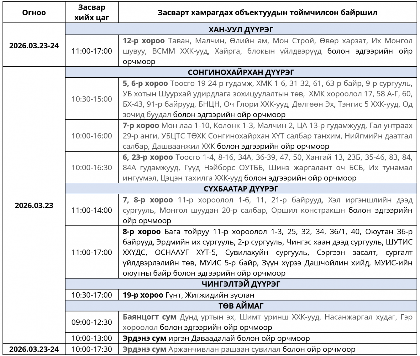 ЖИЧ: Цаг агаарын нөхцөл байдлаас шалтгаалан хуваарьт өөрчлөлт орвол, гэрээт бүртгэлтэй утасны дугаарт мэдээлэл хүргэх болно. Засварын ажлыг тухайн тоноглолоос хүчдэлээс бүрэн чөлөөлсний дараа хийдэг нөхцөл байдлыг харгалзан үзэж, хүлээцтэй хандахыг хэрэгчлэгч та бүхнээс хүсье.